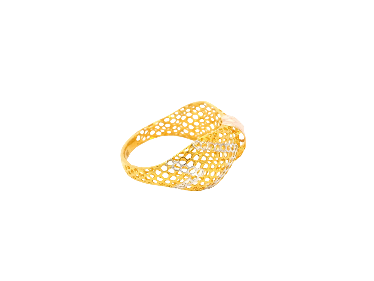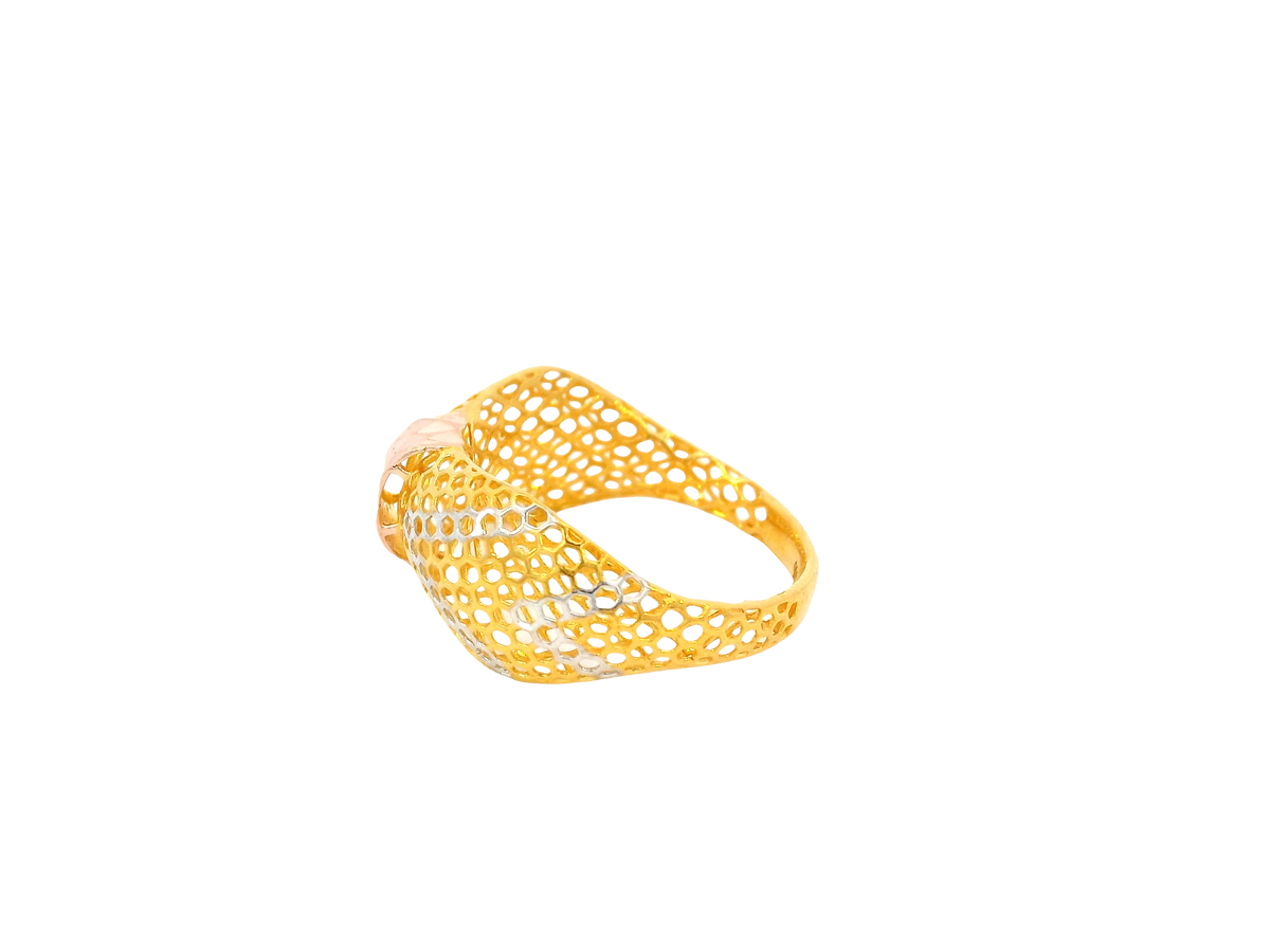 Description:This elegant 22K tri-color ring features a beautiful blend of yellow, white, and rose gold, creating a sophisticated and eye-catching design. Weighing 2.7 grams, it offers a comfortable, lightweight feel while still showcasing the rich brilliance of pure gold. With its polished finish and stylish color contrast, this ring adds a refined touch to both everyday wear and special occasions. Crafted in size 8, it’s a timeless piece that stands out on its own or pairs beautifully with other jewelry. Specifications: Gold Purity: 22K Gold Weight: 2.7 grams Finish: Yellow + White + Rose Gold Ring Size: 8 Ring Sizing Available: No Highlights: Features a striking tri-color design for a unique and elegant look. Lightweight and comfortable for daily wear. Polished finish enhances the brilliance of each gold tone. Perfect as a standout piece or stacked with other rings. A beautiful gift option for someone who appreciates fine gold craftsmanship.