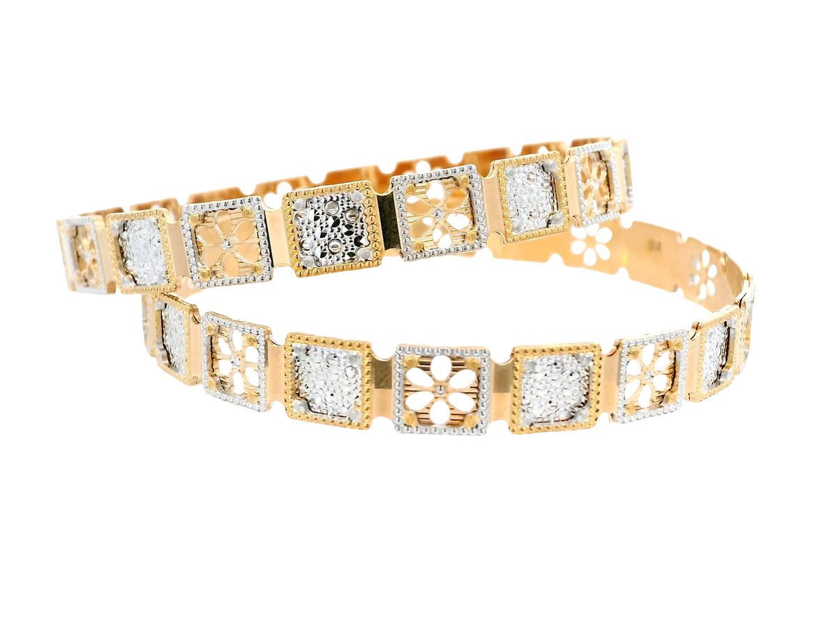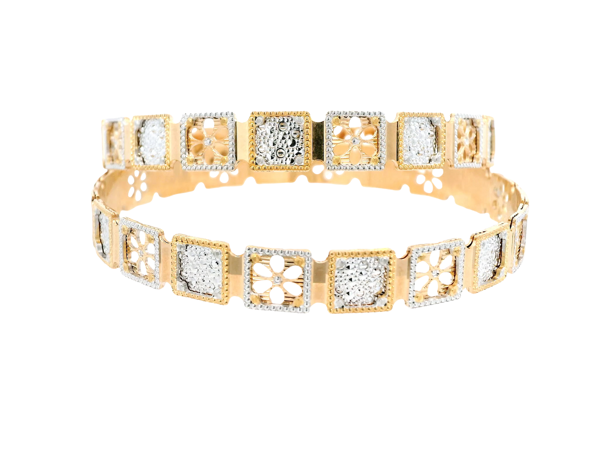 Description:This pair of 22K gold bangles showcases a beautiful blend of yellow and white gold finishes, offering an elegant two-tone design that stands out. With a combined weight of 39.3 grams, these bangles are crafted in size 2.7 and feature a width of 7.45 mm—making them both bold and refined. Whether for special occasions or as a luxurious daily accessory, these bangles provide a perfect balance of tradition and modern flair.