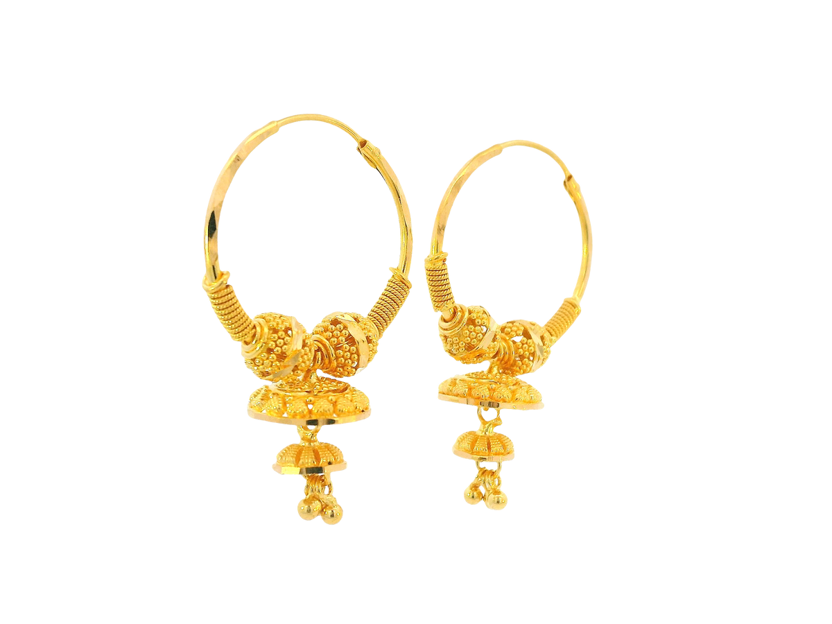 Description:These 22K yellow gold hoop earrings embody timeless elegance with their radiant polished finish and classic design. Weighing 8.5 grams, they provide a more substantial feel while remaining comfortable for extended wear. Perfect for both daily elegance and special occasions, these hoops are a versatile addition to any jewelry collection.