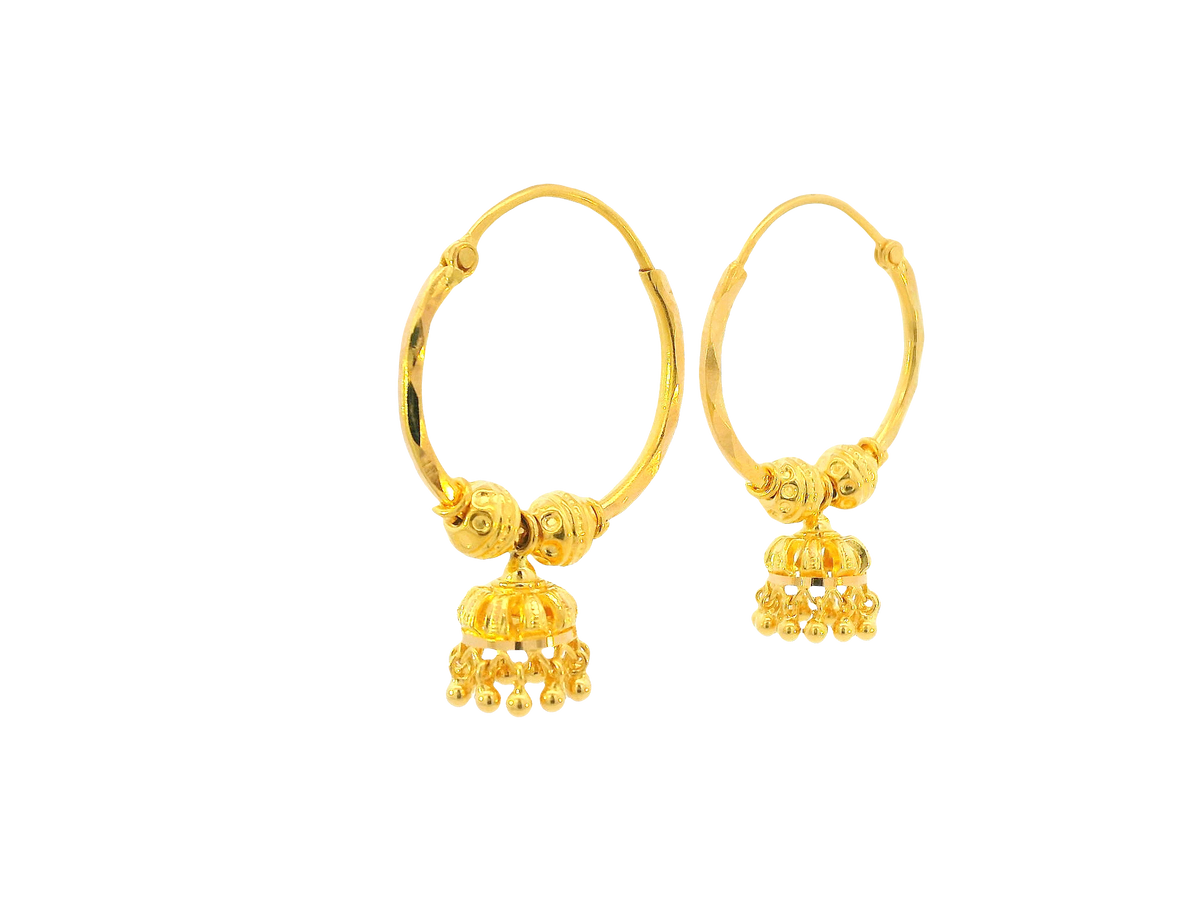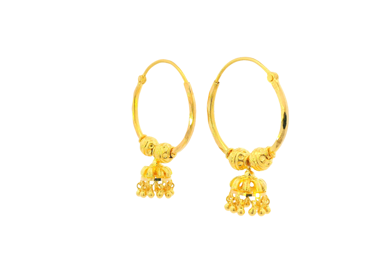 Description:These 22K yellow gold hoop earrings feature a sleek polished finish, bringing out the natural brilliance of pure gold. Weighing 5.5 grams, they are lightweight yet refined, making them a versatile choice for everyday wear or elegant occasions. Their timeless hoop design ensures they remain a classic staple in any jewelry collection.
