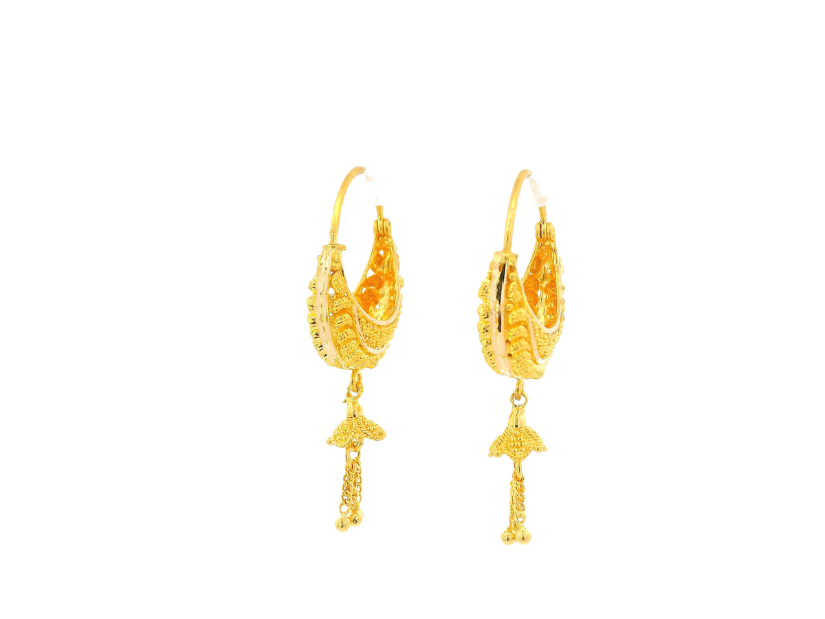 Description:Crafted from pure 22K yellow gold, these hoop earrings radiate timeless elegance with their sleek polished finish. Weighing 6 grams, they offer the ideal balance of durability and comfort, making them perfect for daily wear or special occasions. Their classic hoop silhouette ensures they remain a versatile and essential addition to any fine jewelry collection.