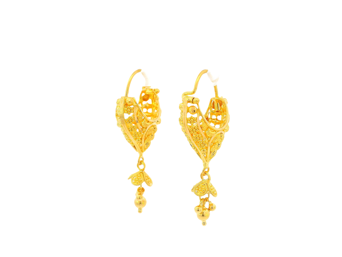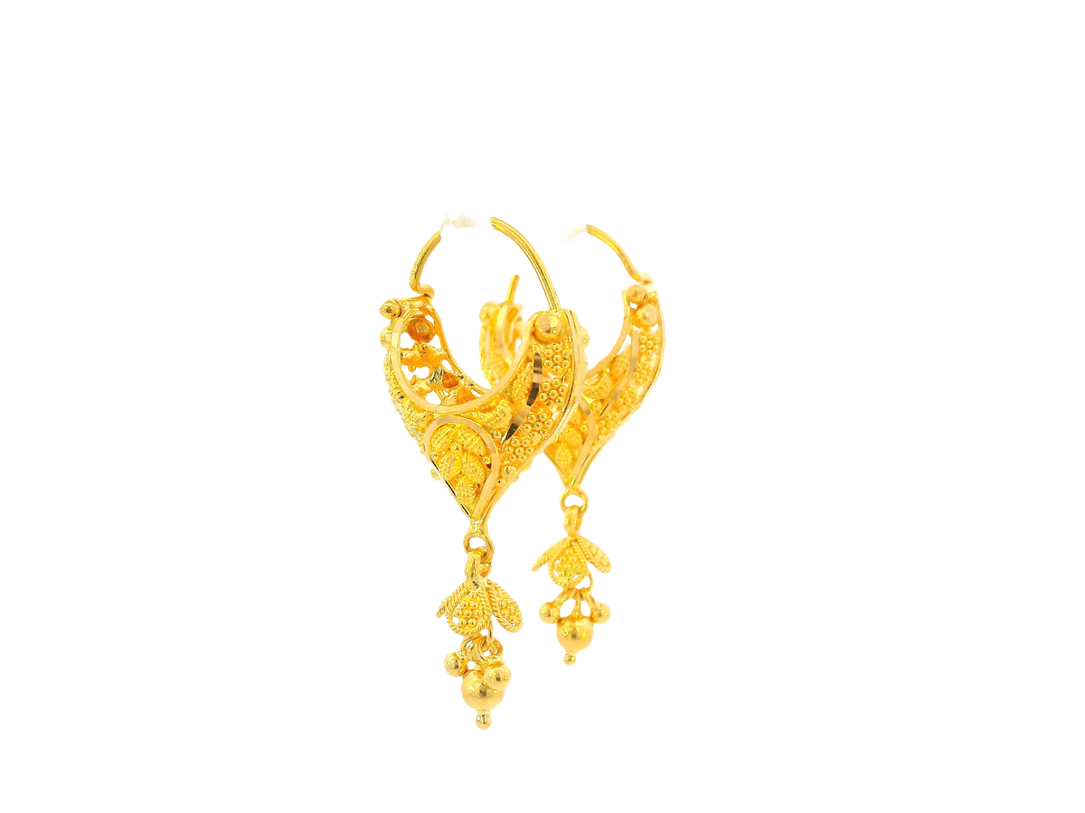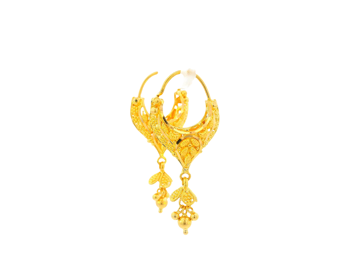 Description:These 22K yellow gold hoop earrings feature a radiant polished finish that highlights their timeless design. Weighing 5.8 grams, they provide a comfortable yet elegant presence, making them perfect for everyday wear or special occasions. Their classic hoop silhouette ensures they remain a versatile accessory in any fine jewelry collection.