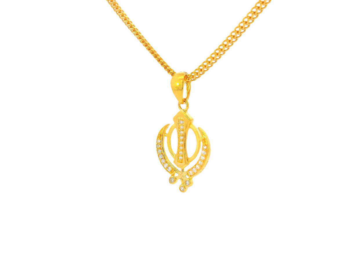 Description:This elegant pendant is crafted from 22K yellow gold and features the iconic Khanda symbol, representing divine power and unity in Sikhism. Accented with shimmering cubic zirconia stones, it measures 1 inch in length and weighs just 2.1 grams—making it a lightweight yet meaningful piece for daily wear or special occasions.