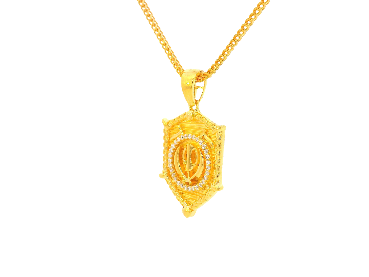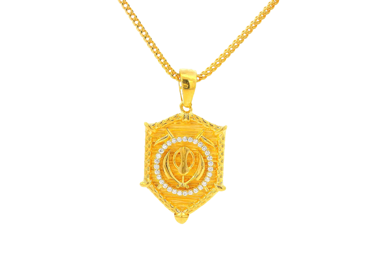 Description:This 22K Yellow Gold pendant beautifully showcases the revered Khanda symbol in a refined and spiritual design. Measuring 1 inch in length and weighing 5.7 grams, the pendant is finished in radiant yellow gold and accentuated with sparkling cubic zirconia stones. A meaningful piece, ideal for those who value heritage, faith, and style, this pendant is perfect for daily wear or as a cherished gift.