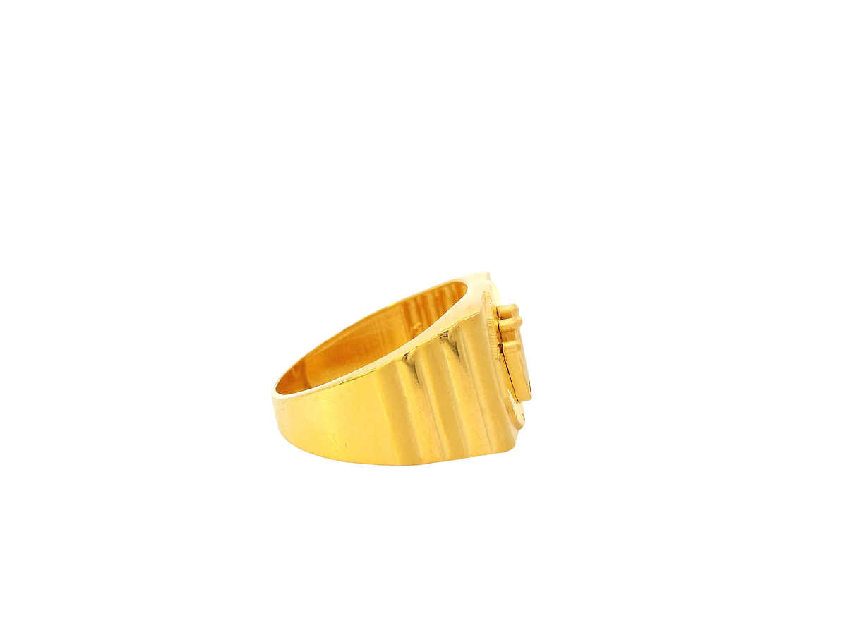 Description:Bold, refined, and expertly crafted, this 22K yellow gold men’s ring carries a strong and luxurious presence. Weighing 8.6 grams, it features a polished finish that enhances the rich glow of pure gold. Designed in size 9.5 with sizing available, this ring offers both comfort and sophistication—perfect for daily wear or special occasions. A timeless piece that complements any man’s jewelry collection.